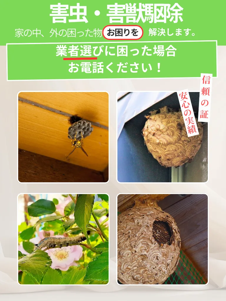 - 害虫駆除:ゴキブリ、ハチ(スズメバチ等)、ネズミ、ムカデ、ダニ、ノミなど
