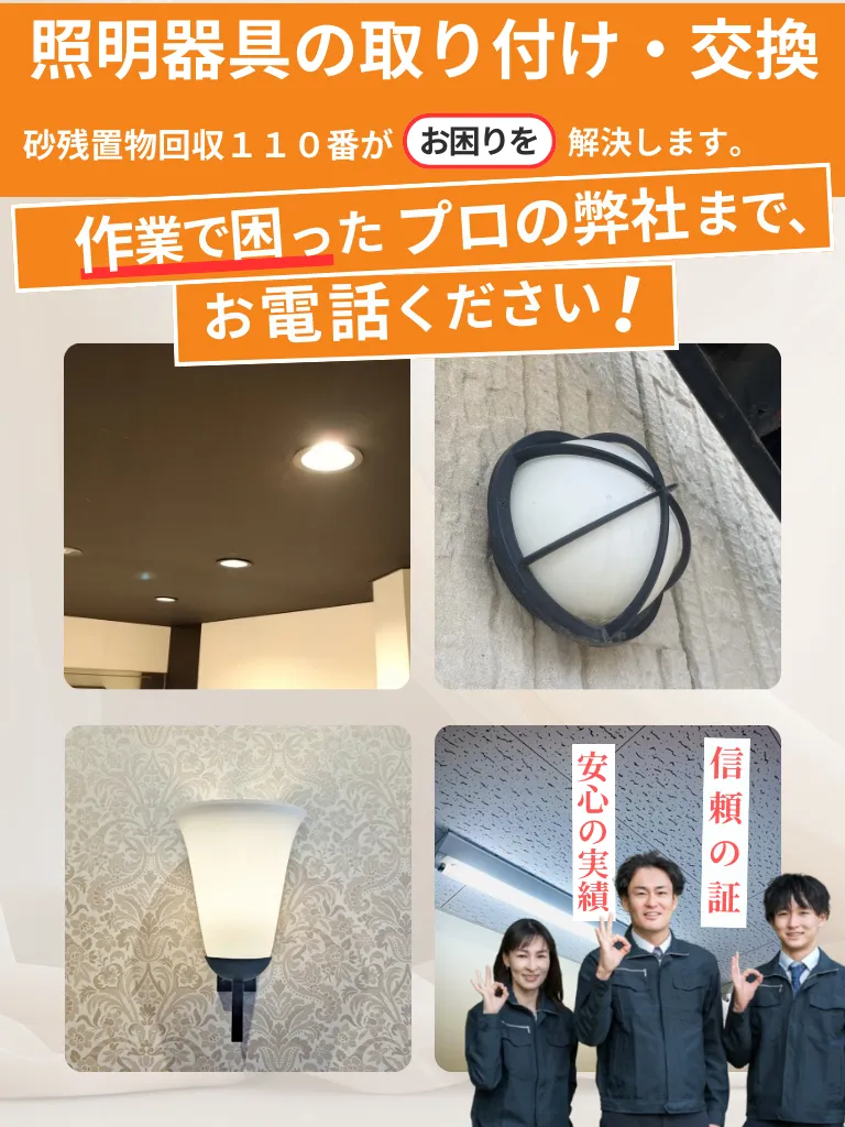 不動産残置物回収110番では、仙台市での照明器具の交換・取り付けに必要な費用を項目ごとに分かりやすく提示します。見積もり後の不当な追加請求は一切ありません!
